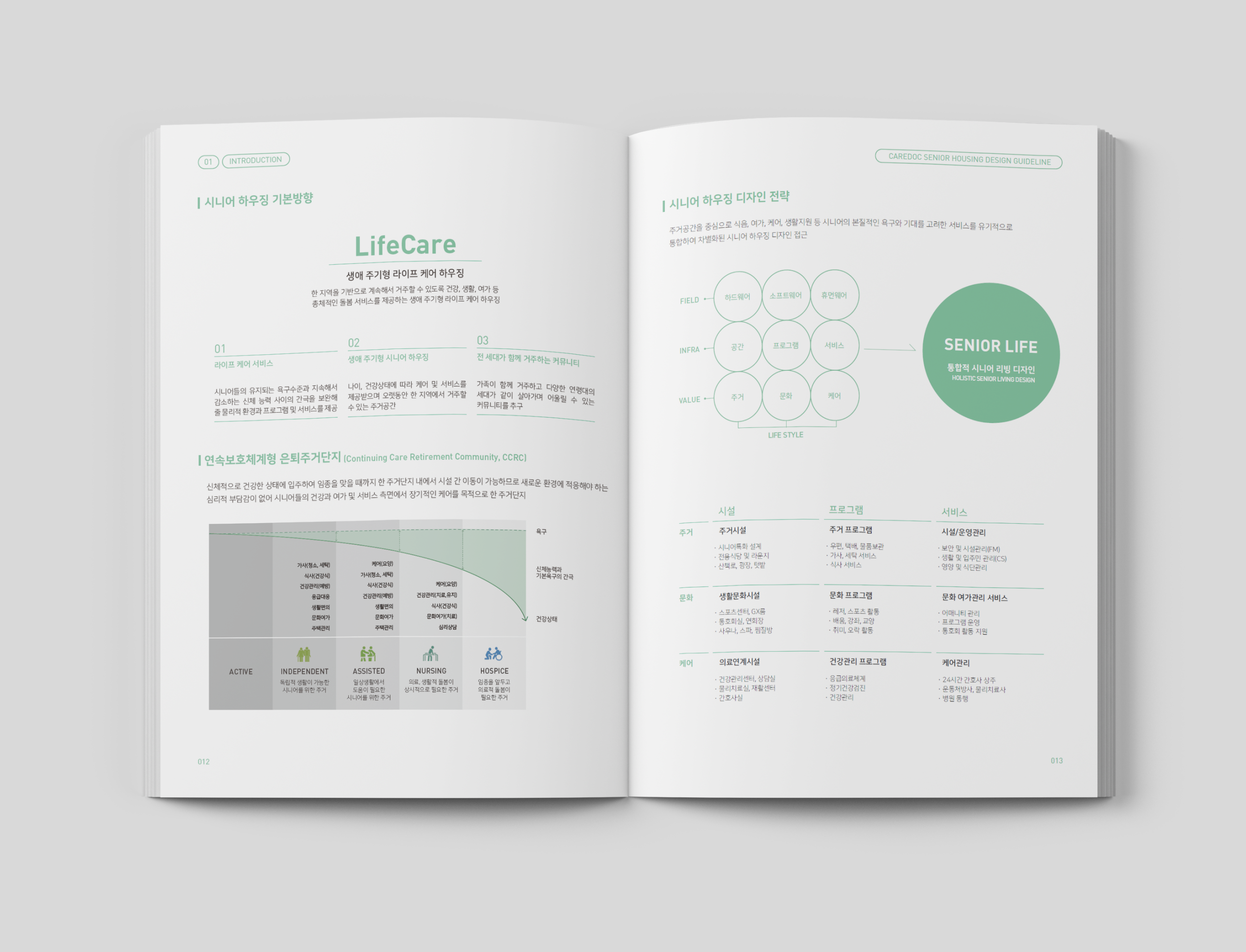 The basic principles of senior housing outlined in this guideline are as follows. First, Life Care Services aim to bridge the gap between the ongoing needs of seniors and the gradual decline in their physical abilities by providing physical environments and various programs and services. Second, Lifecycle Senior Housing refers to residential spaces where seniors can receive appropriate care and services based on their age and health status, allowing them to live in the same area for an extended period. Third, Intergenerational Communities focus on fostering communities where not only families live together but also different generations coexist and interact.