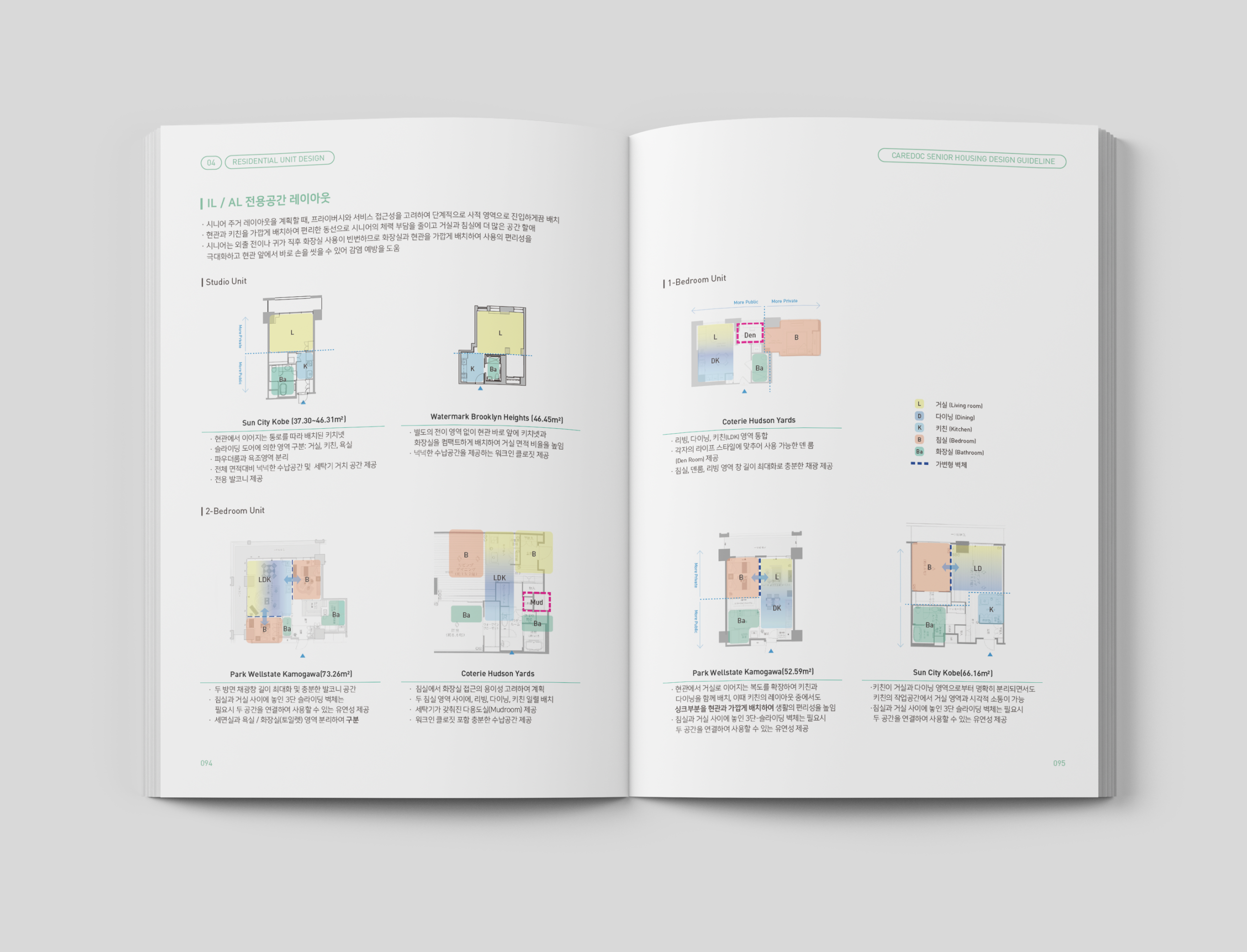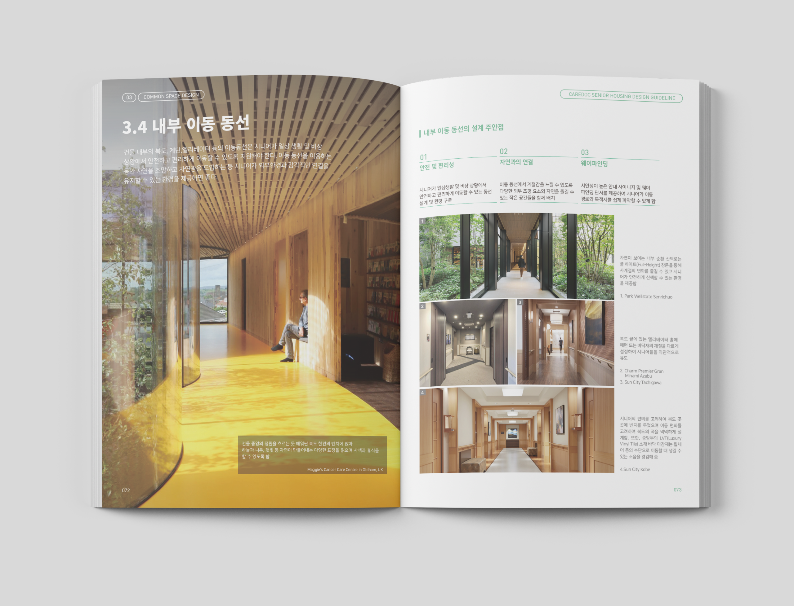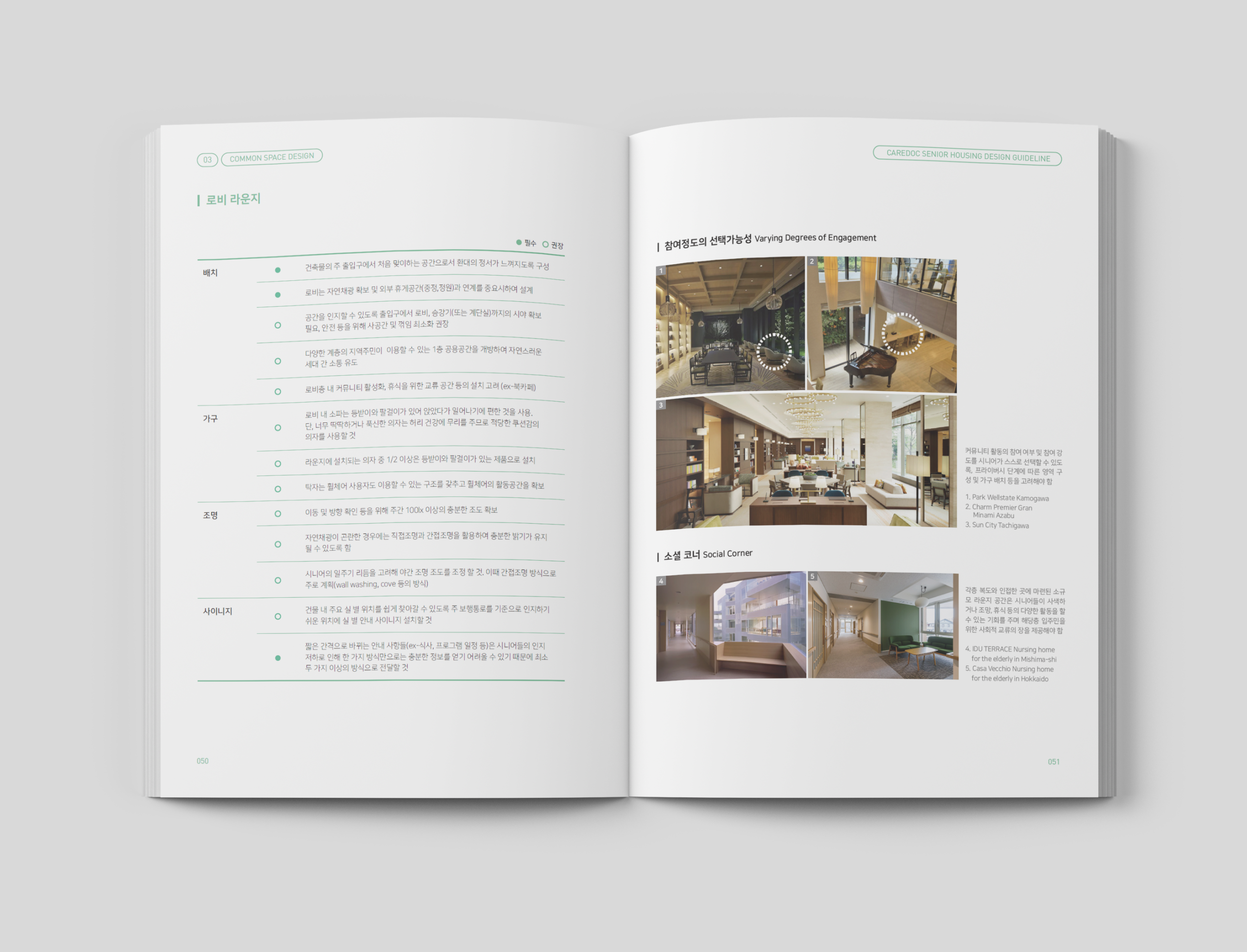 Senior housing should transcend traditional institutional- and facility-centered models by providing care environments that respond to changes in residents’ health status, guaranteeing lifestyles aligned with individual preferences, preserving independence in daily activities, and facilitating sustained engagement with the community. This guideline has been developed to establish comprehensive and practical standards for senior housing, aiming not only to enhance the physical design of residential spaces but also to promote holistic senior care and improve overall quality of life. It aspires to serve as a new benchmark for senior living environments.