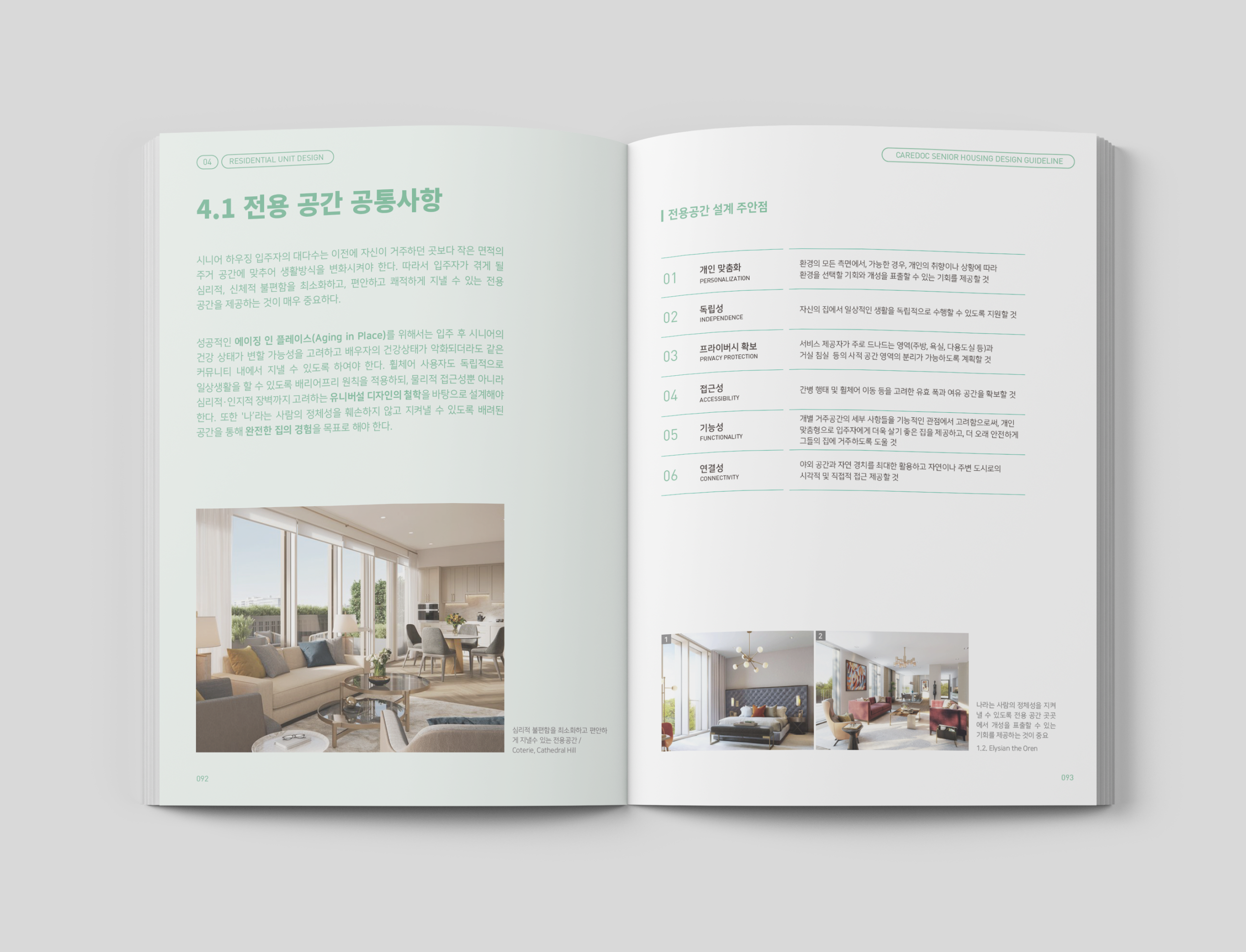 “성공적인 에이징 인 플레이스(Aging in Place)를 위해서는 입주 후 시니어의 건강 상태가 변할 가능성을 고려하고 배우자의 건강상태가 악화되더라도 같은 커뮤니티 내에서 지낼 수 있도록 하여야 한다. 휠체어 사용자도 독립적으로 일상생활을 할 수 있도록 배리어프리 원칙을 적용하되, 물리적 접근성뿐 아니라 심리적·인지적 장벽까지 고려하는 유니버설 디자인의 철학을 바탕으로 설계해야 한다. 또한 ‘나’라는 사람의 정체성을 훼손하지 않고 지켜낼 수 있도록 배려된 공간을 통해 완전한 집의 경험을 목표로 해야 한다.”