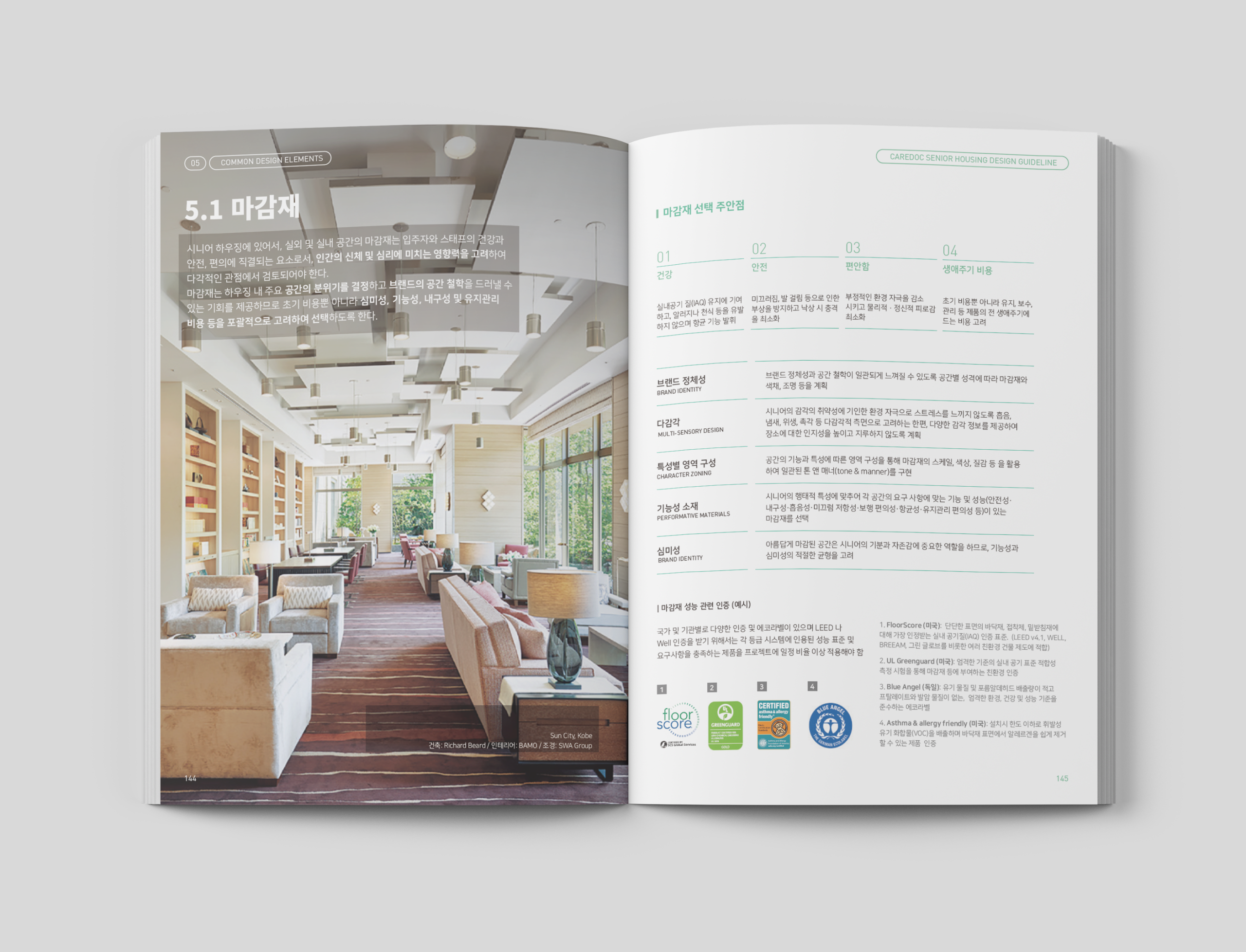 “시니어 하우징에 있어서, 실외 및 실내 공간의 마감재는 입주자와 스태프의 건강과 안전, 편의에 직결되는 요소로서, 인간의 신체 및 심리에 미치는 영향력을 고려하여 다각적인 관점에서 검토되어야 한다.