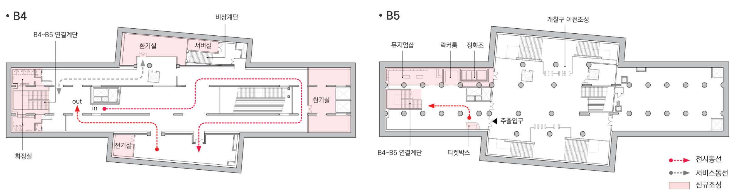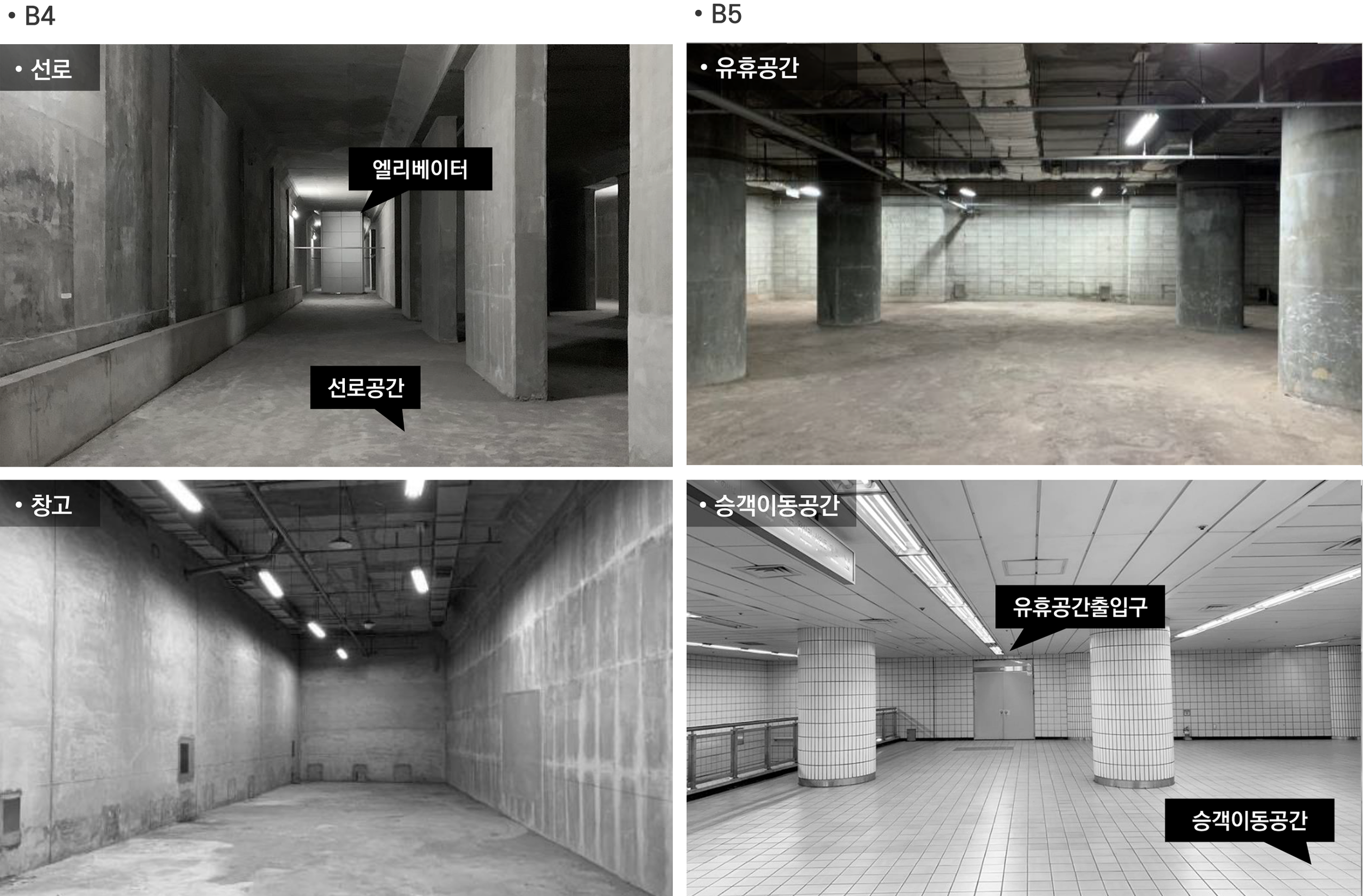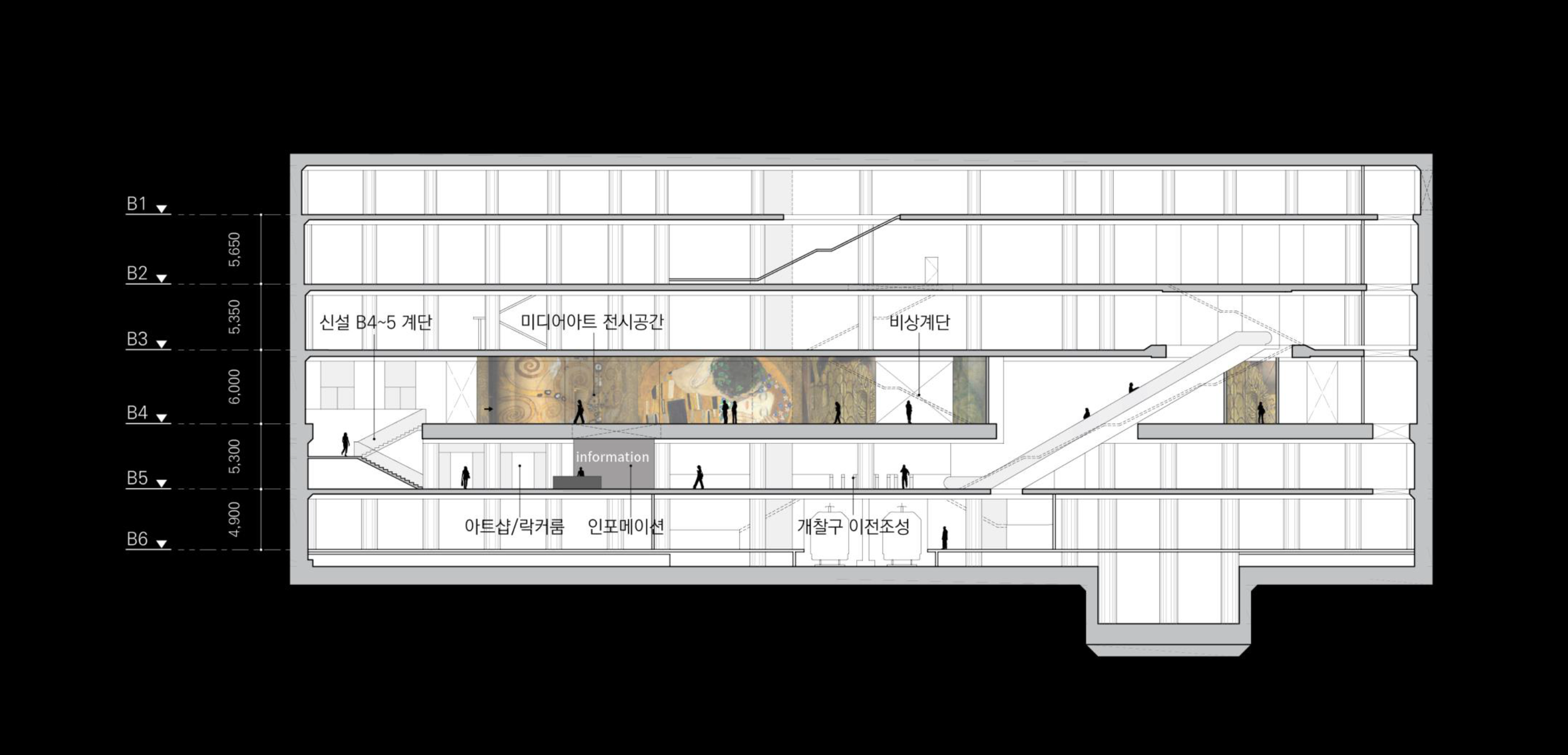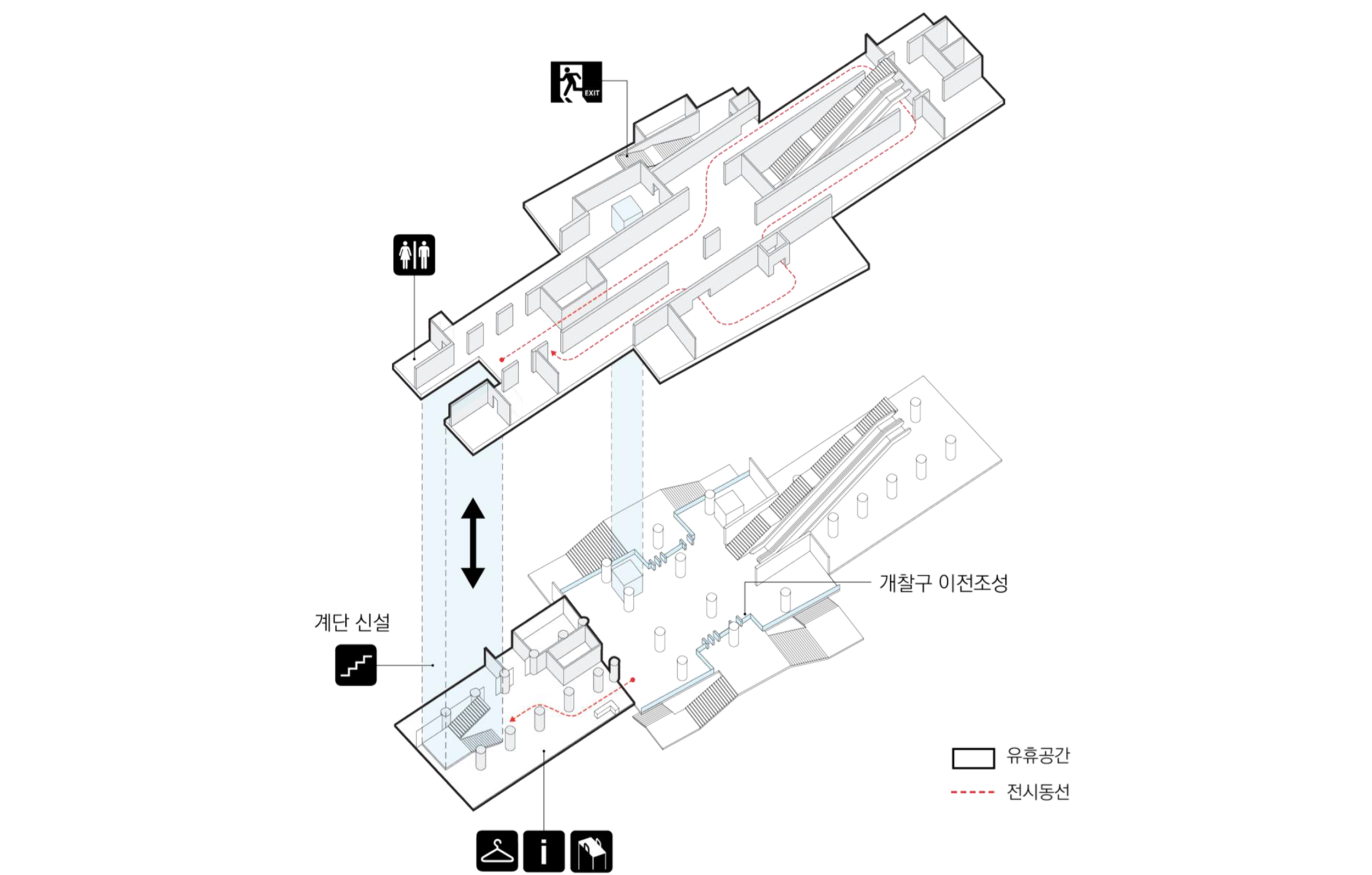 A comprehensive review of Yeongdeungpo Market Station’s physical structure—including access routes from ground level and underground, evacuation conditions, the environmental characteristics of the windowless underground space, and relevant regulations—led to the proposal of integrating the two unused basement levels into a single, purpose-defined space. Taking into account the physical environment, the plan suggests utilizing the space as an immersive media art exhibition hall. In addition, to ensure safe evacuation and accommodate the exhibition flow, a new vertical circulation route is proposed, which would connect the underground space directly to the ground level.