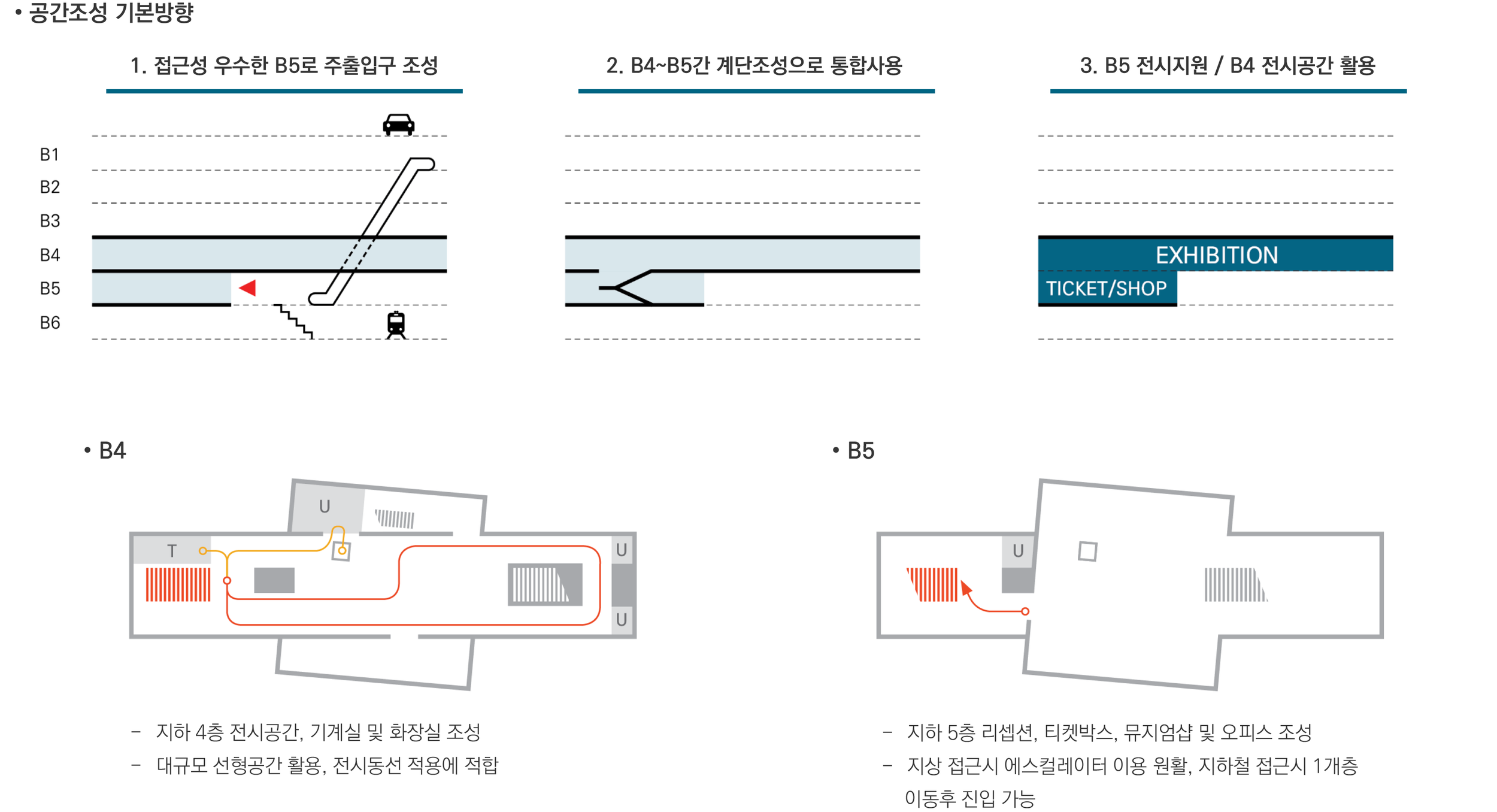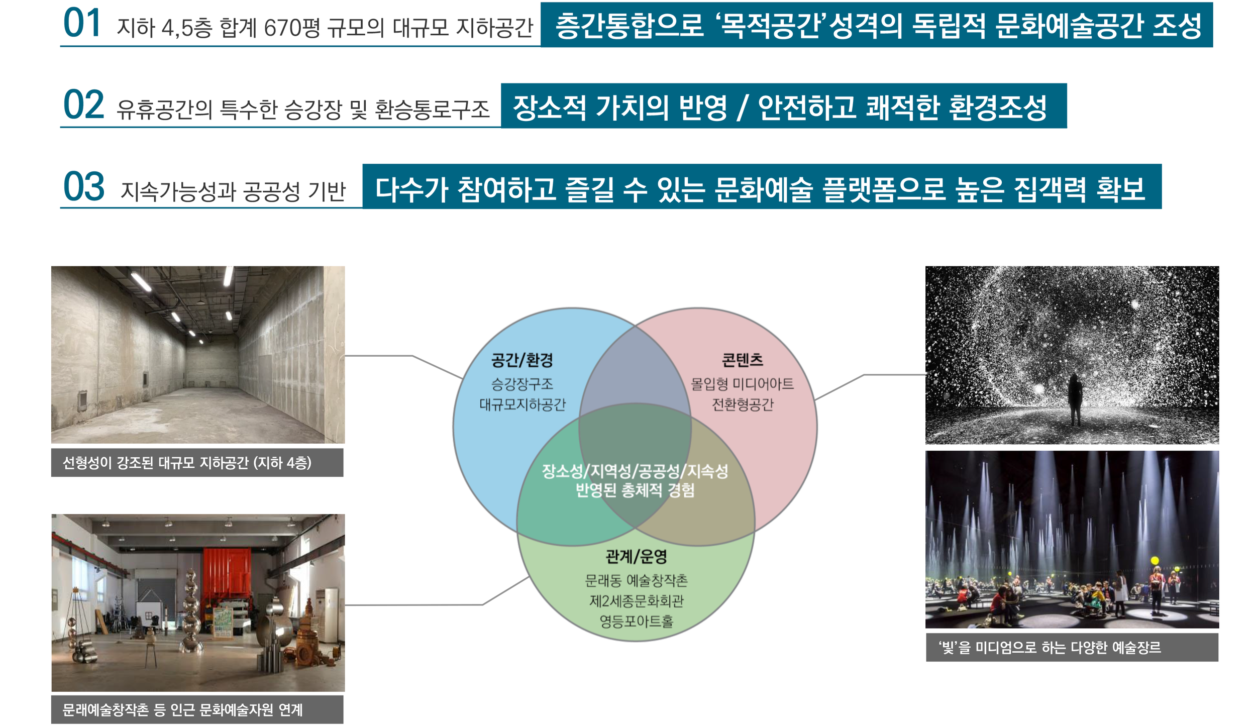 영등포 시장역의 물리적 구조, 지상과 지하로부터의 접근 동선, 피난 환경, 무채광 지하공간의 환경적 조건, 관련 법규 등을 종합적으로 검토한 결과, 유휴공간 2개층을 통합하여 뚜렷한 목적공간의 성격을 부여하고, 물리적 환경을 감안하여 몰입형 미디어 아트 전시장으로의 활용을 제안하였다. 또한 전시동선을 고려하여 신규 수직동선을 조성하고 이를 지상부까지 연결가능하도록 하여 피난안전을 확보하도록 계획하였다.