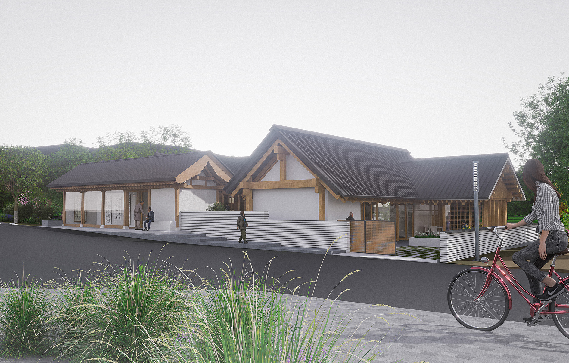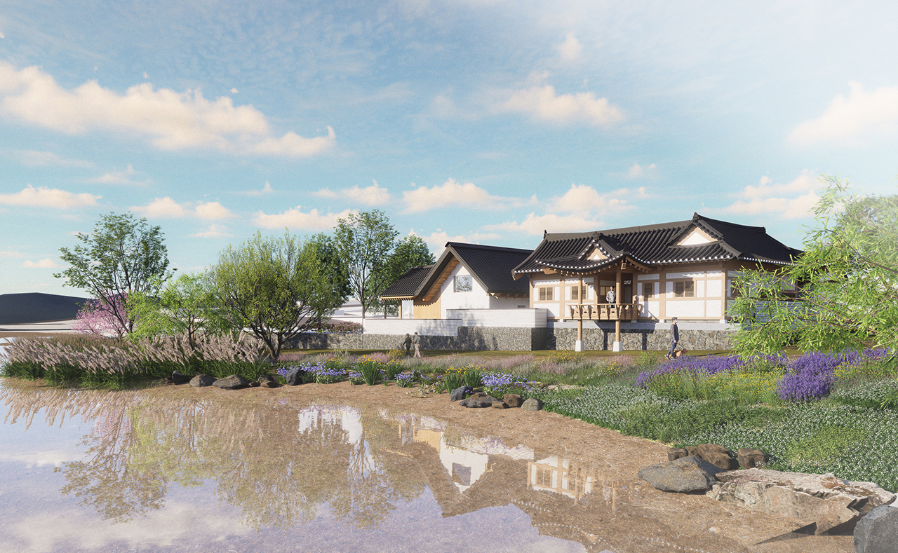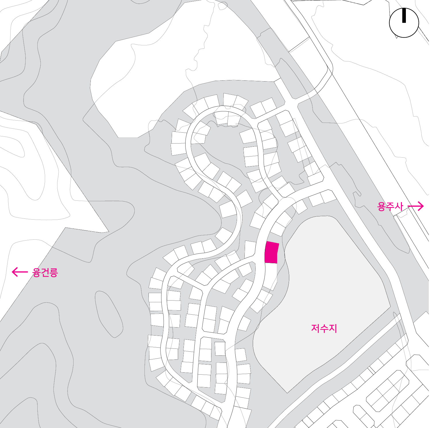 The project site is located on the northern edge of a hanok residential district in Hwaseong City, between Yungneung & Geolleung Royal Tombs and Yongjusa Temple, with a 15-meter-wide road to the west and a waterside area to the east. The elongated north–south orientation and shape of the site posed environmental challenges for design.