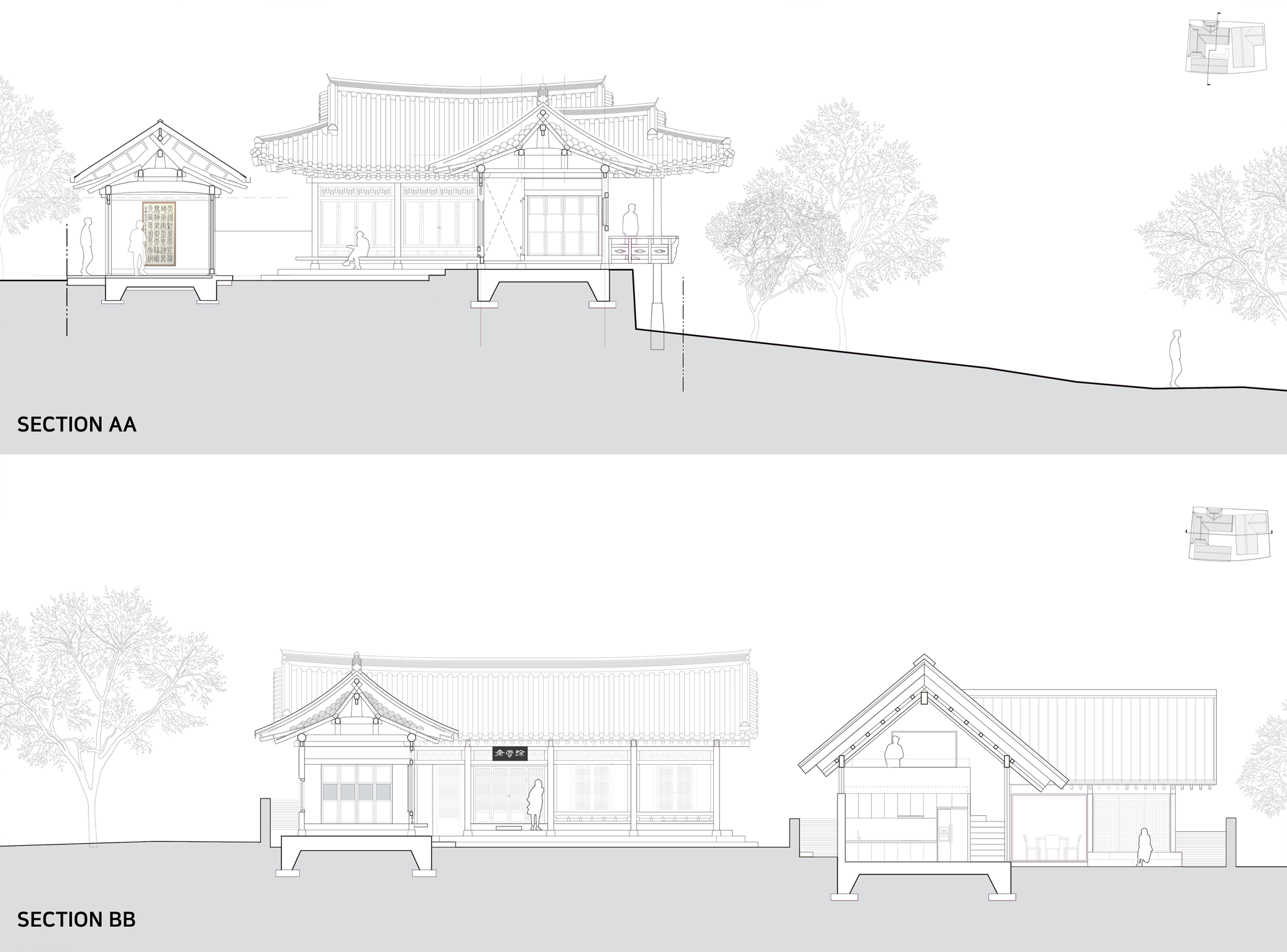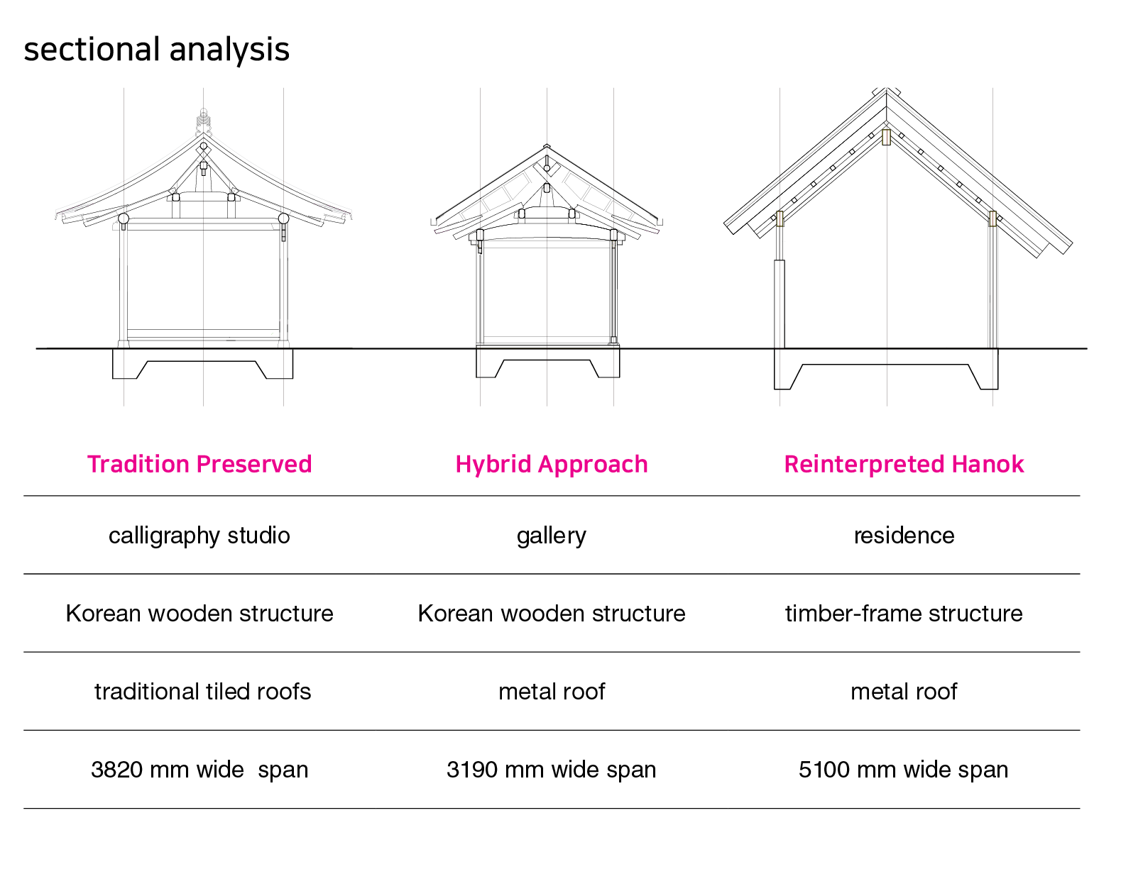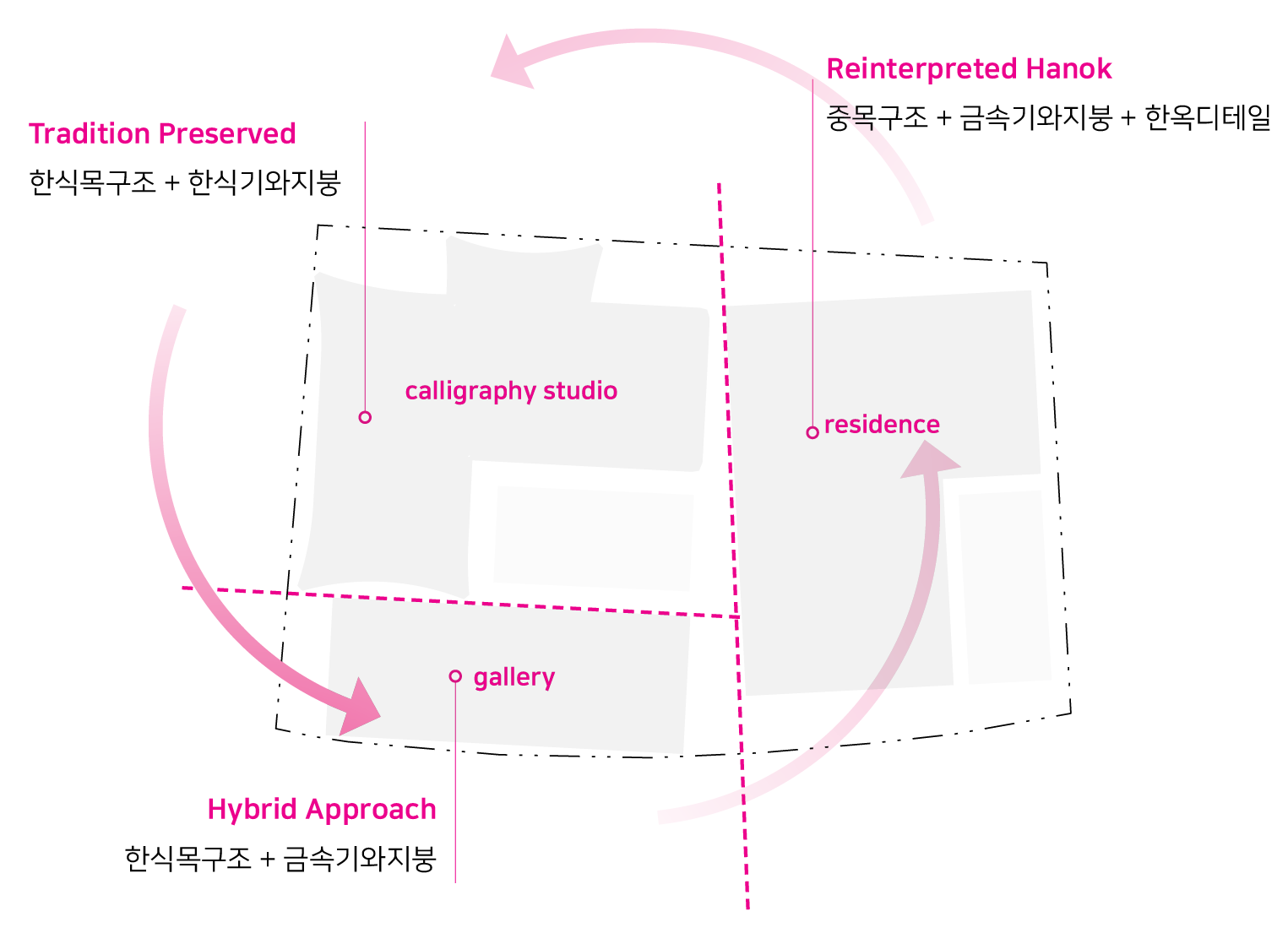 각 프로그램은 개별적 ‘채’로 나뉘어져 있고, 각 ‘채’들은 각기 다른 방식으로 한옥의 전통을 수용한다. 세가지 재구상된 한옥이 한 대지위해 공존함으로써 전통적 유산과 실험적 다양성 사이의 지속적인 대화를 열고자 한다.