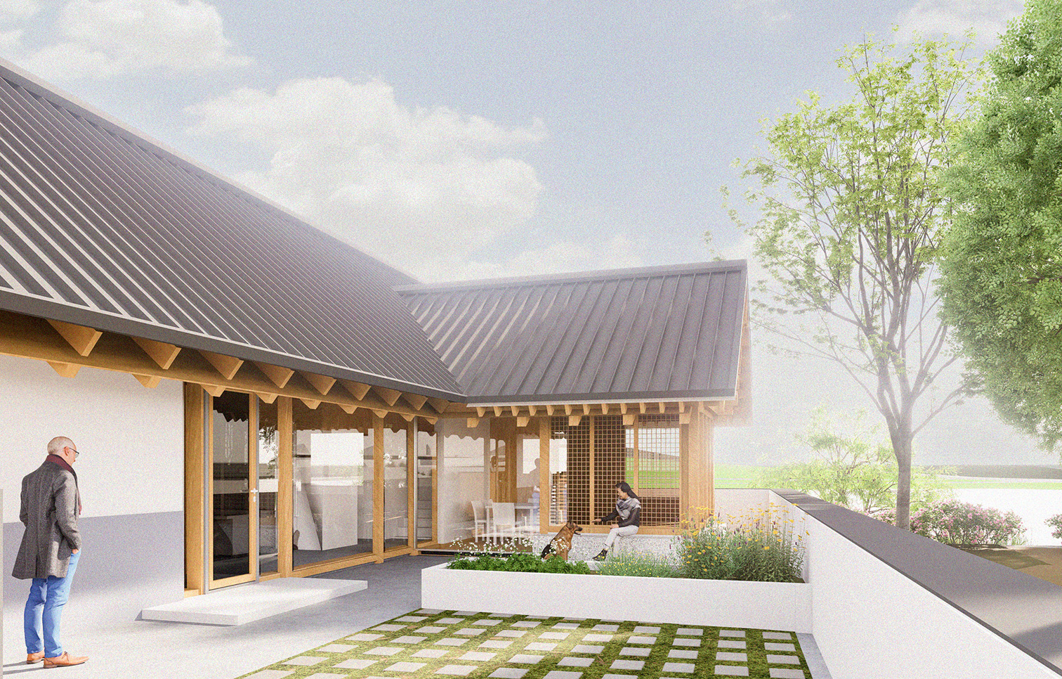 중목구조를 사용하여 계획된 주택은 전통한옥의 경간 제한을 극복하고 보다 넒은 실내공간을 제공한다. 한옥지붕의 비례감과 서까래 배치의 밀도 및 리듬감 등을 재현하기 위해 다소 과장된 매너로 고안된 디테일을 적용하였다.