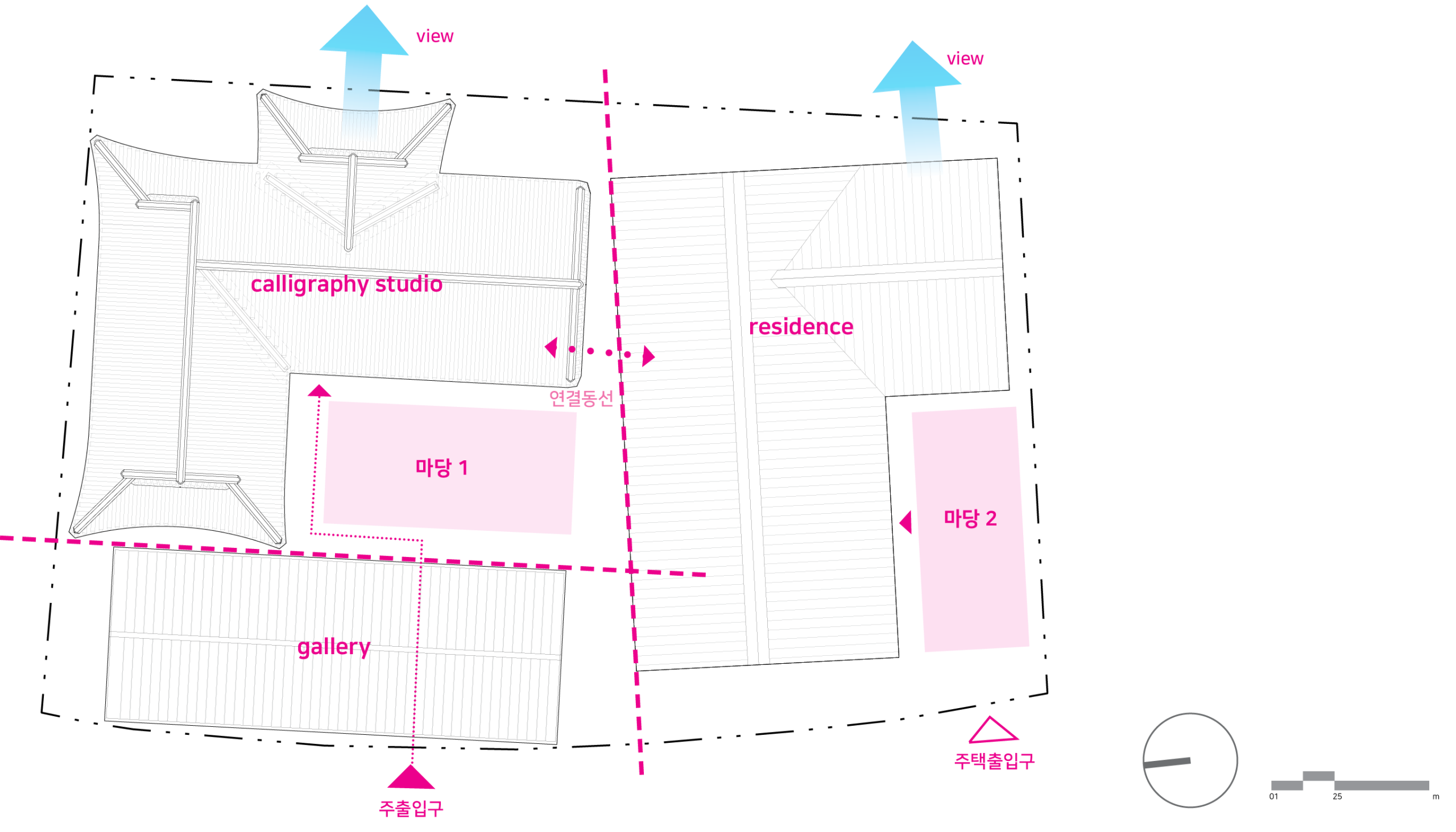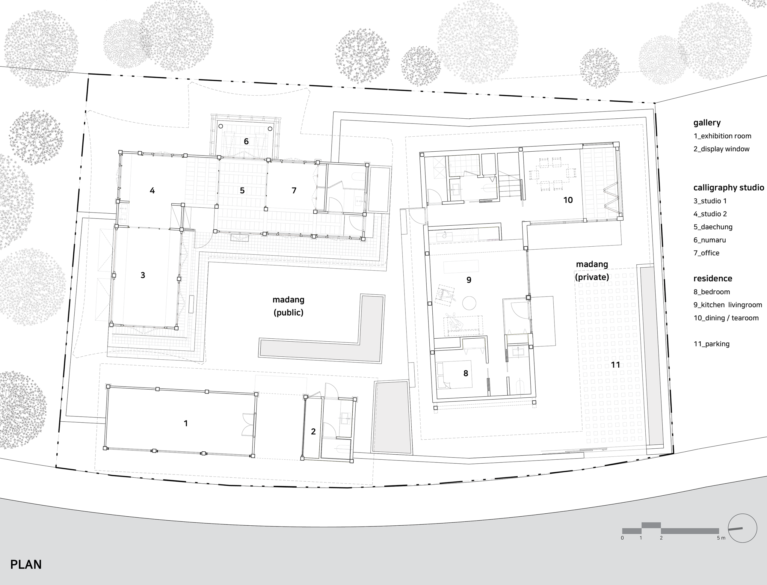 북측의 마당은 전시관람객과 서예교습생들이 자유롭게 사용할 수 있는 열린 공간으로 사랑채에 딸린 마당과 비슷한 느낌이 되도록 의도했다. 주택에 연결된 마당은 보다 조용한 환경에서 사적 자유를 누릴 수 있도록 계획하였다.