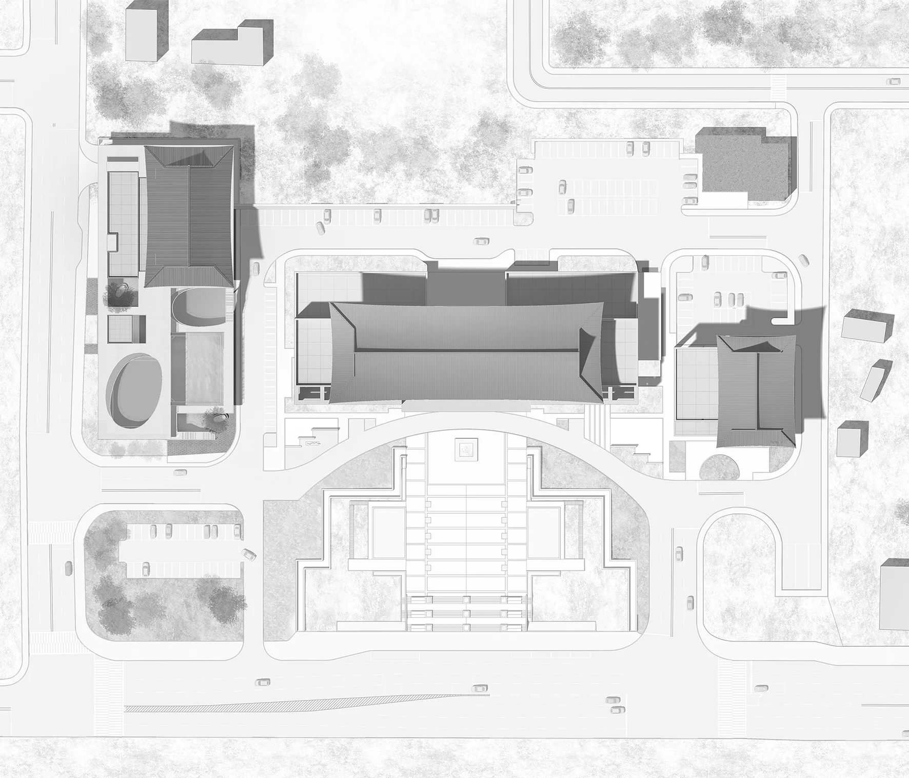 군청사 단지 배치의 조화를 고려하여 판의 일부를 비우고 연결을 위한 공간을 형성함